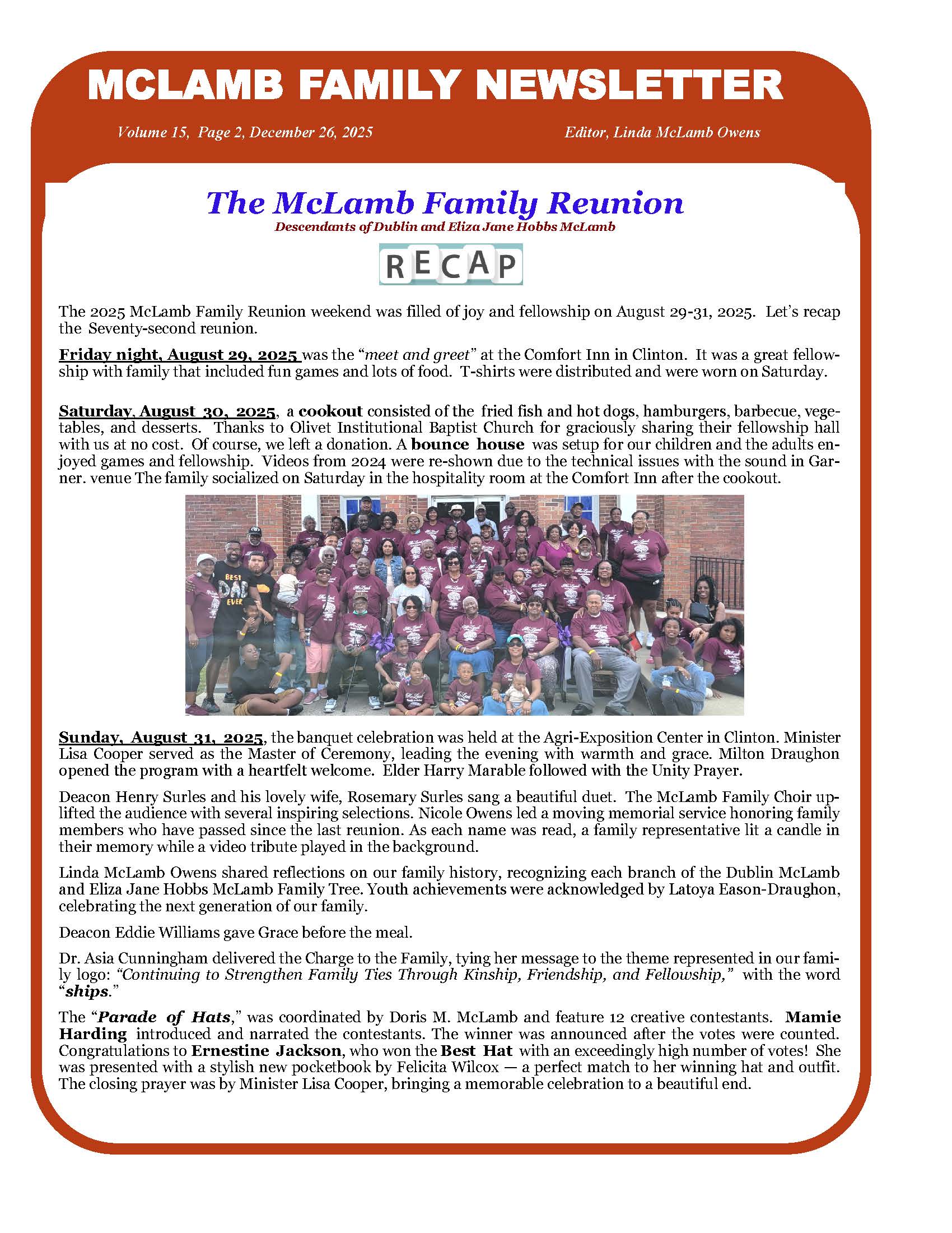 Year 2023 marked the 70th Anniversary of the McLamb Family Reunion. A souvenir booklet full of family stories and traditions with an attempt to capture all seventy reunions from 1953 to 2023 was created.